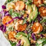 - Add roasted sweet potatoes and avocado: Top the mixture with the roasted sweet potato slices and sliced avocado for creaminess and natural sweetness.