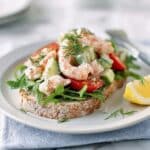 This open prawn cocktail sandwich offers a light and refreshing combination of succulent North Atlantic prawns tossed with a tangy, dill-infused mayonnaise and reduced-sugar ketchup dressing. Served on wholemeal bread with fresh cucumber, cherry tomatoes, and peppery rocket, it’s a quick and healthy lunch option bursting with vibrant flavors.