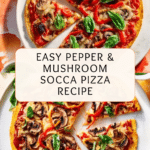 A delicious and healthy Pepper & Mushroom Socca Pizza featuring a gluten-free chickpea flour base topped with sautéed peppers, mushrooms, fresh tomatoes, garlic, basil, and melted mature cheddar cheese. Perfect as a light meal or snack, this recipe blends Mediterranean flavors with a nutritious twist.