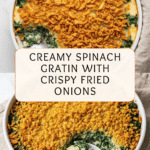 This Quick and Easy Spinach Gratin is a creamy, comforting casserole perfect for a simple side dish or light meal. Made with frozen spinach, cream cheese, and condensed cream of mushroom soup, it combines rich flavors with a crispy fried onion topping for a deliciously satisfying dish that comes together in under 30 minutes.