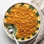 This quick and easy spinach gratin is a comforting side dish bursting with creamy mushroom flavor and crispy fried onions. Perfect for busy weeknights or as a crowd-pleasing addition to your holiday table.
