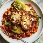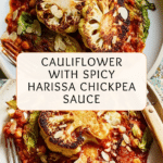 This roasted cauliflower with harissa and chickpea sauce is a flavorful and comforting dish perfect for any season. The tender cauliflower is marinated, roasted, and served with a rich, spiced tomato and chickpea sauce, topped with creamy tahini yogurt and toasted almonds. It’s a vibrant meal that’s both satisfying and healthy.