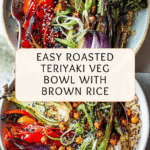 Keywords: roasted vegetables, teriyaki bowl, vegan recipe, healthy dinner, brown rice, chickpeas, easy roast dinner, plant-based meal