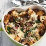 This Rustic Bake with Escarole is a hearty and comforting dish, perfect for using up rustic bread and fresh greens. Packed with spicy Italian sausage, wild mushrooms, and gooey gouda, it’s a flavorful meal that comes together easily and bakes into a deliciously savory casserole.