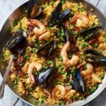 A vibrant and flavorful traditional Spanish seafood paella featuring king prawns, monkfish, mussels, peas, and broad beans cooked in a rich homemade seafood stock infused with smoked paprika, saffron, and garlic.