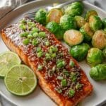 This Sheet Pan Teriyaki Salmon with Brussels sprouts is a quick and nutritious meal perfect for busy weeknights. The salmon is roasted to tender perfection alongside caramelized Brussels sprouts, both coated in a flavorful homemade teriyaki sauce made from soy sauce, honey, garlic, and ginger. Finished with a sprinkle of sesame seeds and green onions, and served with lime wedges for a fresh zing.