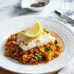 A flavorful spiced bulgur pilaf cooked with cumin, harissa, and dried apricots, topped with tender white fish fillets and fresh baby spinach. This one-pot dish combines aromatic vegetables and spices with nutritious bulgur and flaky fish for a comforting and wholesome meal.