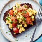 A flavorful and wholesome tofu scramble featuring a blend of spices, sautéed onions, and juicy cherry tomatoes. Perfect as a vegetarian or vegan breakfast or brunch option, served on its own or with toasted rye bread for added texture and taste.