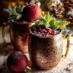 Two ornate copper mugs with detailed round patterns and golden handles sit on a white marbled surface dusted with powdered sugar. Each mug is filled with a dark liquid topped with bright red pomegranate seeds and fresh, frosted green mint leaves, creating a colorful contrast. One mug is topped with a large red glittery ornament, adding a festive touch. Soft, warm lighting highlights the textures and metallic shine, with a blurred cozy background of pinecones and fairy lights. photo taken with an iphone --ar 4:5 --v 7
