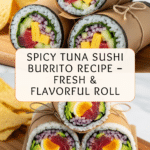 Keywords: spicy tuna burrito, sushi burrito, ahi tuna recipe, sushi roll, homemade sushi, spicy sushi, fusion cuisine