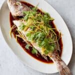 - Assemble and serve: Top the fish with the sliced spring onion, finely sliced chili, most of the coriander, and the remaining ginger matchsticks. Pour the hot soy sauce mixture over the fish generously to ‘cook’ the fresh aromatics. Scatter any leftover coriander stalks over the top for garnish and serve immediately.