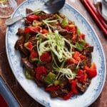 - Finish and Serve: Return the drained beef to the wok and toss with the oyster sauce and peppers to combine evenly. Transfer everything to a serving platter, sprinkle the finely shredded spring onions on top, and serve immediately.