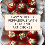 Keywords: stuffed peppadews, artichoke appetizer, feta cheese appetizer, Mediterranean snacks, no-cook appetizers, party snacks, vegetarian appetizer