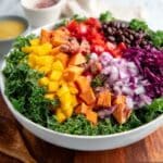 - Assemble the Salad Base: In a large bowl, place the chopped kale as the foundation of the salad. Then, layer the chopped tomatoes, cooked and peeled chopped sweet potatoes, sliced bell pepper, fresh blueberries, sliced red onion, and cooked cubed beets on top of the kale.