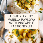 Keywords: Vanilla pavlova, pineapple, passion fruit, meringue, crème fraîche dessert, summer dessert, tropical fruit pavlova, easy pavlova recipe