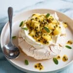 Vanilla pavlova with pineapple and passion fruit is a light, elegant dessert perfect for any occasion. Crisp on the outside and soft inside, it’s topped with tangy tropical fruit and creamy vanilla-flavored crème fraîche for a refreshing treat.