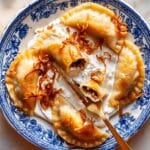 Varenyky are traditional Eastern European dumplings filled with a savory blend of sauerkraut, mushrooms, and chestnuts. This recipe offers a comforting dish perfect for sharing, topped with crispy shallots and served with rich crème fraîche.
