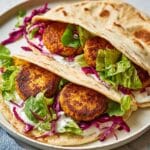 - Finish and Serve: Pile the crispy tempeh on top of the assembled flatbreads, fold them over, and serve alongside the remaining salad leaves for a fresh and satisfying vegan kebab meal.
