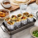 10. Serve or Store: Wrap each burrito in aluminum foil. Serve immediately or place in a zip-lock bag and freeze for up to three weeks for convenient future meals.