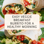 This Veggie Breakfast Burrito is a delicious and wholesome morning meal featuring soft scrambled eggs, sautéed onions, bell peppers, and fresh spinach wrapped in warm flour tortillas with melted Mexican cheese, salsa, and creamy avocado. Perfect for a nutritious and flavorful start to your day.