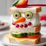 Keywords: snowman sandwich, whimsical sandwich, kids lunch, festive snack, cheddar cheese sandwich, vegetable sandwich, creative sandwich idea